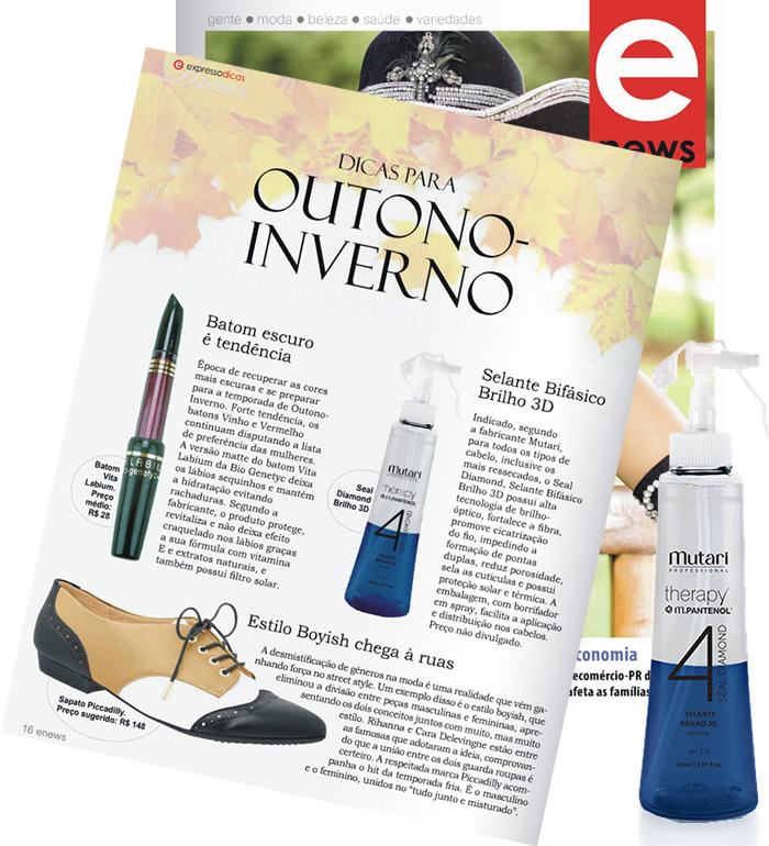 Para os cabelos, a Revista indicou o Seal Diamond Brilho 3D da Mutari. Isto porque, além de ser indicado para todos os tipos de cabelos, até mesmo para os mais ressecados, o Selante Bifásico Brilho 3D possui alta tecnologia de brilho-óptico, fortalece a fibra capilar e promove cicatrização do fio impedindo a formação de pontas duplas, muito comuns em dias secos e frios.