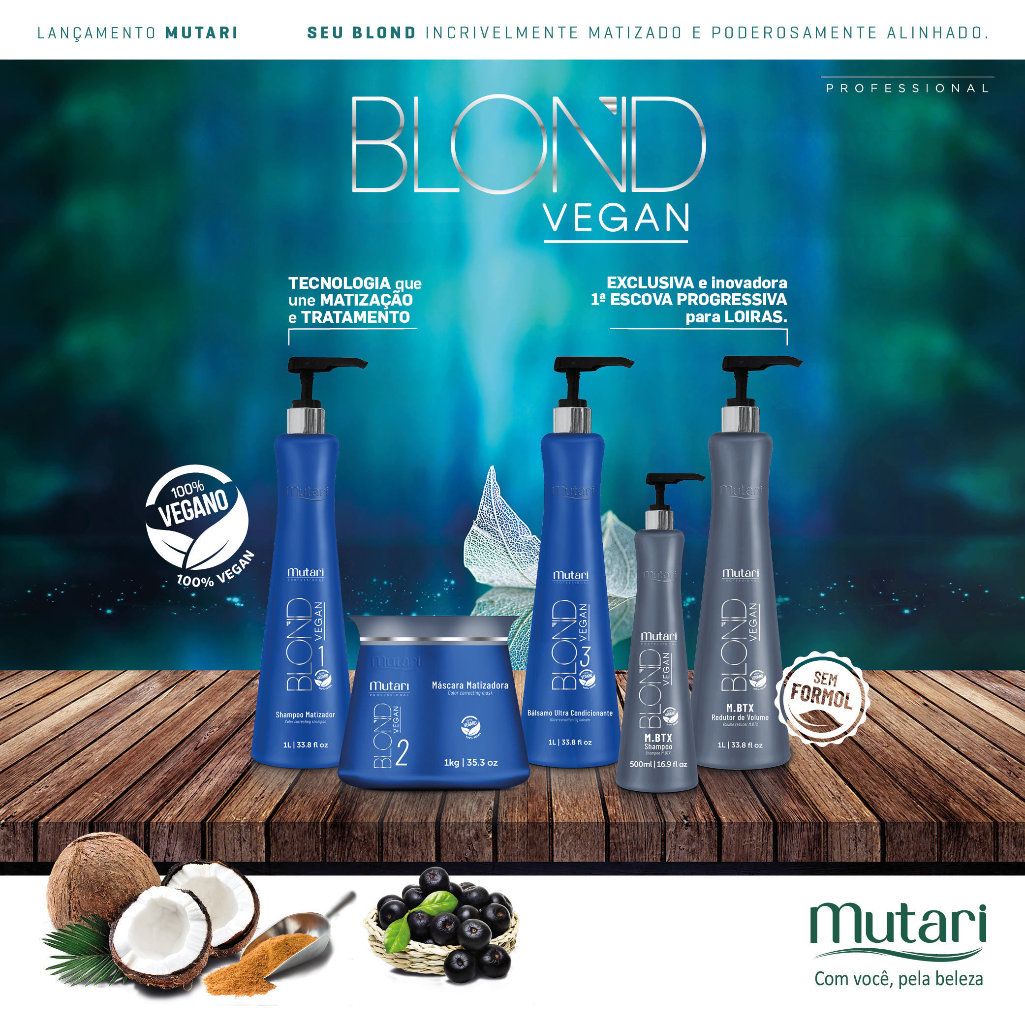 Sabendo da complexidade de manter a tonalidade das madeixas claras, a Mutari desenvolveu produtos exclusivos para matização, alinhamento e tratamento do cabelo loiro. Eles fazem parte da nossa linha Blond Vegan.